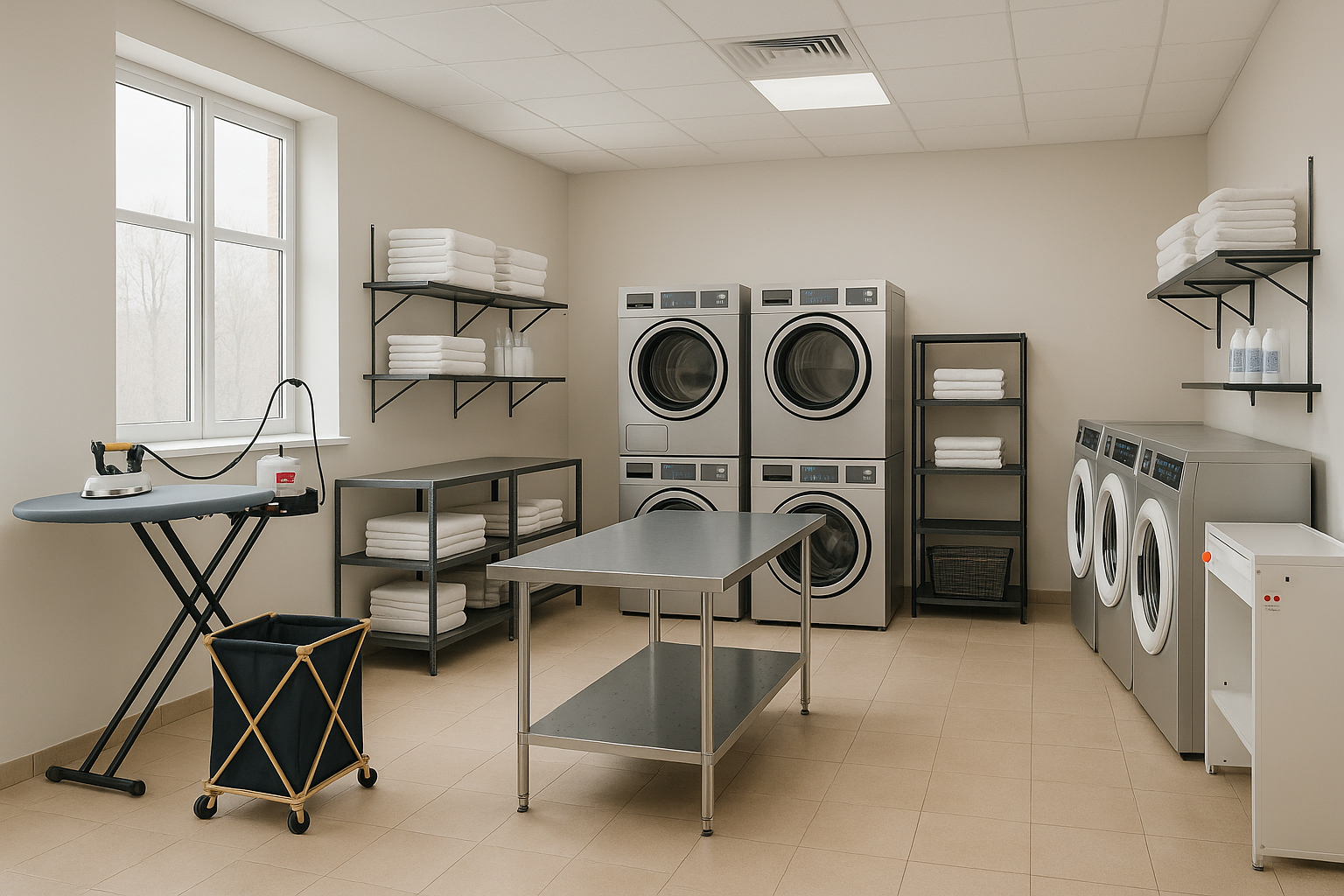 Продуманы системы хранения, рабочие поверхности для сортировки белья, зоны для глажки и стирки. Прачечная зона отвечает санитарным и эксплуатационным требованиям, создавая аккуратное и понятное пространство, удобное для всех жителей общежития.