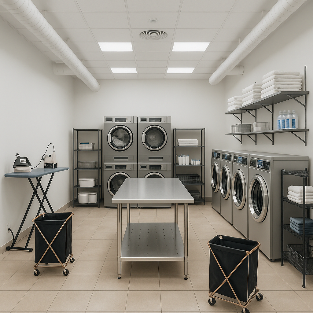 Планировочное решение обеспечивает логичную организацию процессов стирки и сушки, разделение рабочих зон и комфортное перемещение.